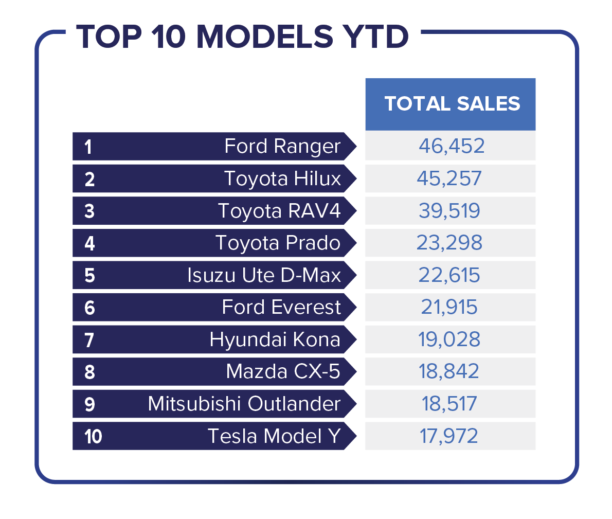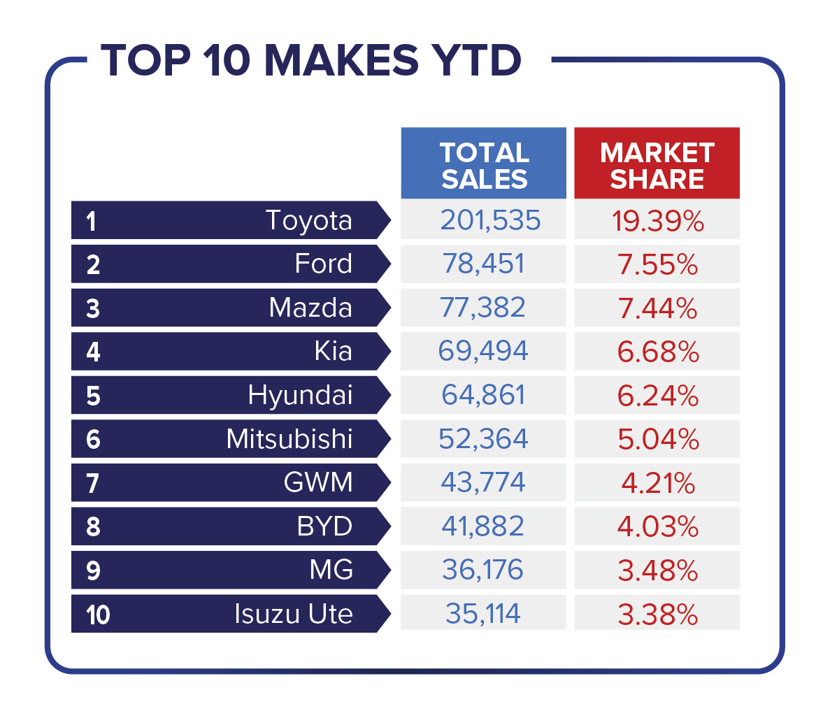 The top-selling brands year-to-date were led by Toyota, retaining strong leadership with 201,535 units and 19.39 per cent market share. The Ford Ranger remains Australia’s highest selling model with 46,452 sales YTD.