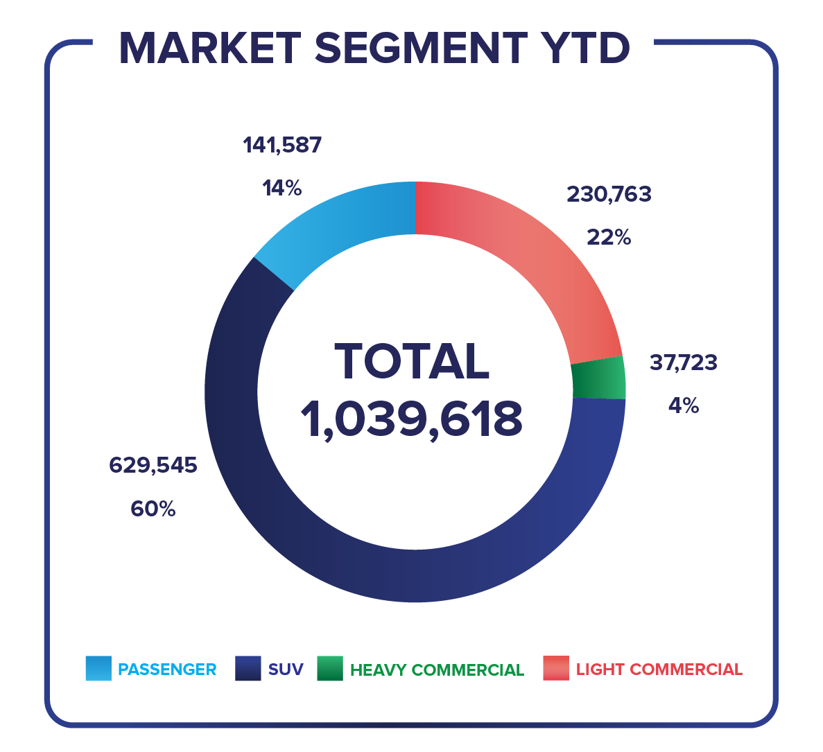 Market segment data shows SUVs remain the dominant preference for Australian motorists, representing 60 per cent of total sales year-to-date. Passenger vehicles accounted for 22 per cent, with light commercials at 14 per cent and heavy commercials at 4 per cent.
